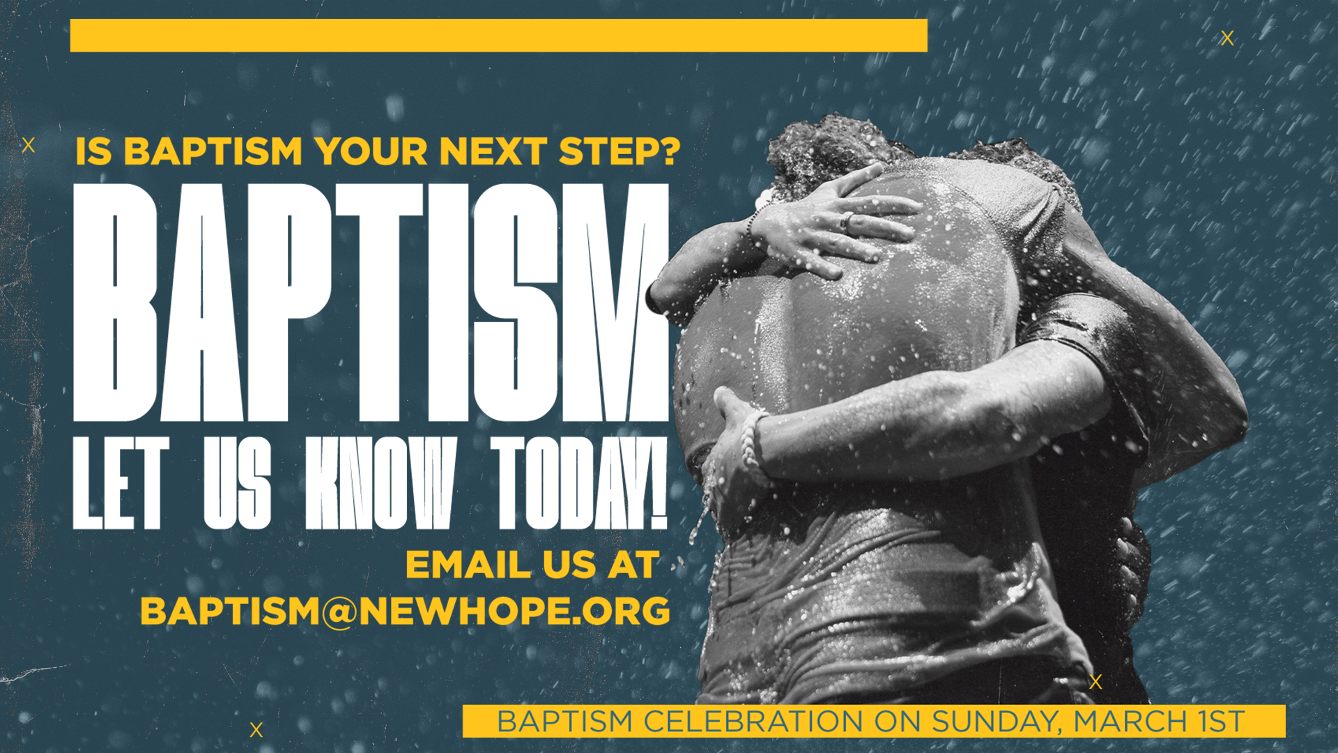 New Hope is excited to celebrate baptisms during services on March 1st. If you know you want to get baptized, please email us at baptism@newhope.org, and we will reach out to you with the next steps! If your elementary-aged child is ready for baptism, email familyministry@newhope.org.