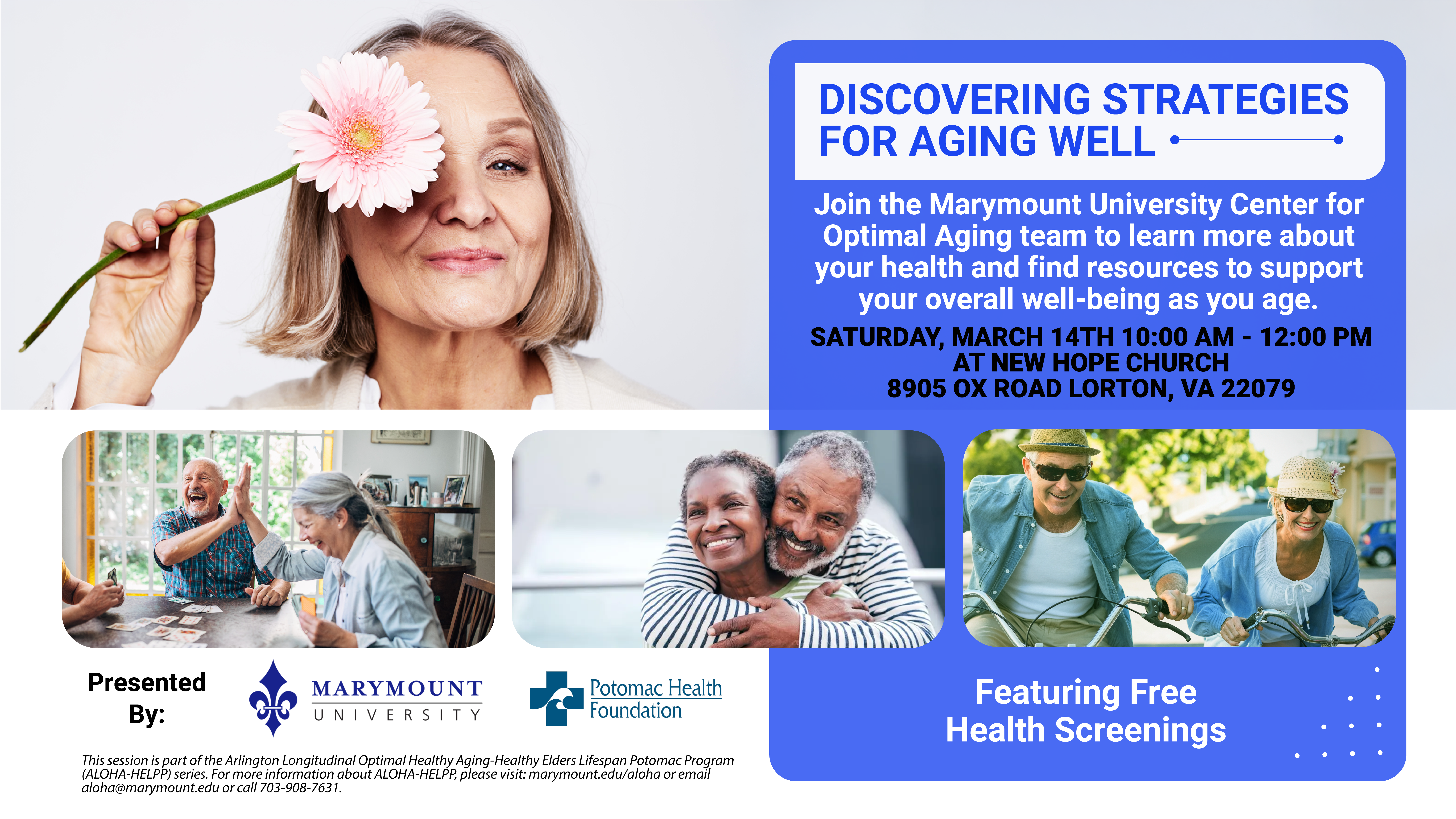 Marymount University’s Center for Optimal Aging offers specialized programs for residents 50+ to promote longevity through evidence-based health education, nutrition, physical activity, and mental wellness. Key strategies include staying socially connected, managing stress, pursuing lifelong learning, and engaging in regular health screenings.