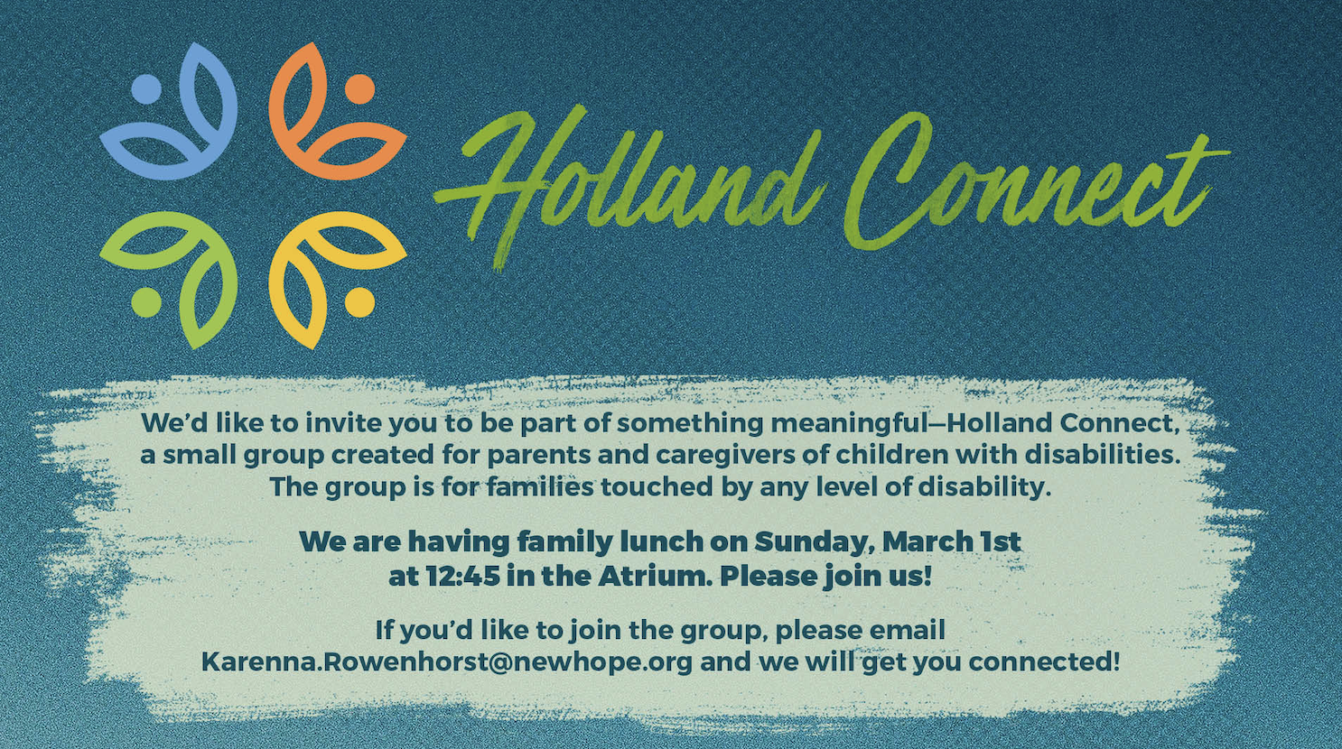 We’d like to invite you to be part of something meaningful—Holland Connect, a small group created for parents and caregivers of children with disabilities. The group is for families touched by any level of disability. Raising a child with unique needs can be both rewarding and challenging. Holland Connect is a space where families can come together to share experiences, offer support, and build lasting connections with others who truly understand the journey.