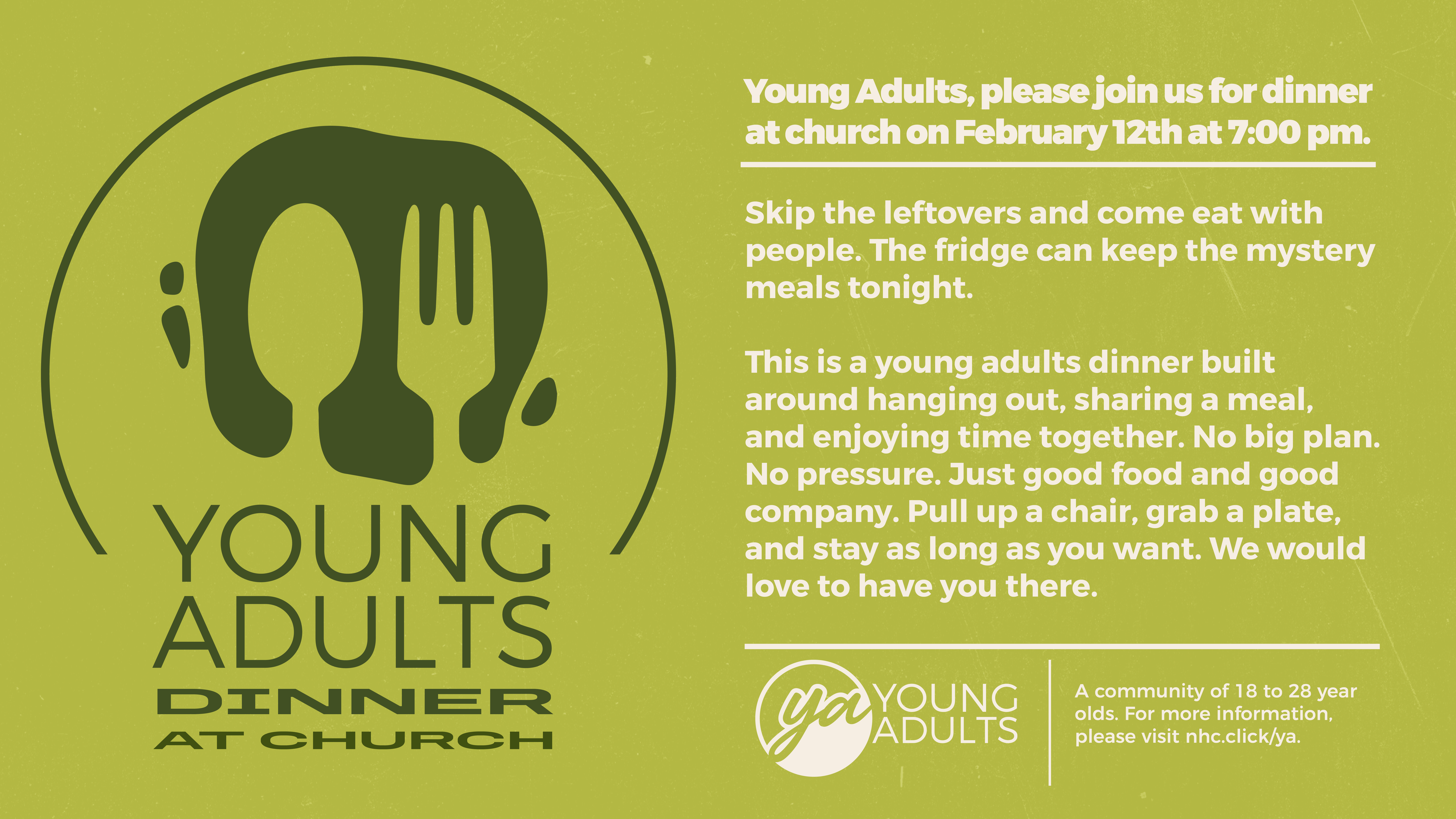 This is a young adults dinner built around hanging out, sharing a meal, and enjoying time together. No big plan. No pressure. Just good food and good company. Pull up a chair, grab a plate, and stay as long as you want. We would love to have you there.